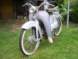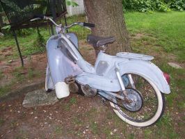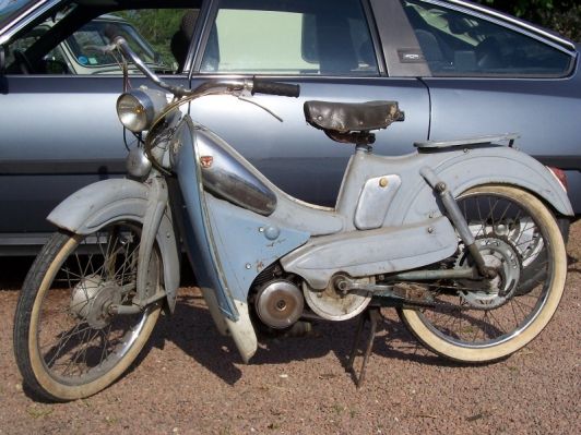 Cet exemplaire est resté "dans son jus" et est toujours fonctionnel. Une restauration lui fera du bien. Cela lui permettra de retrouver sans teinte originelle, le célèbre bleu Mobylette, car actuellement elle est obligée de supporter ce gris mal peint et défraichit...